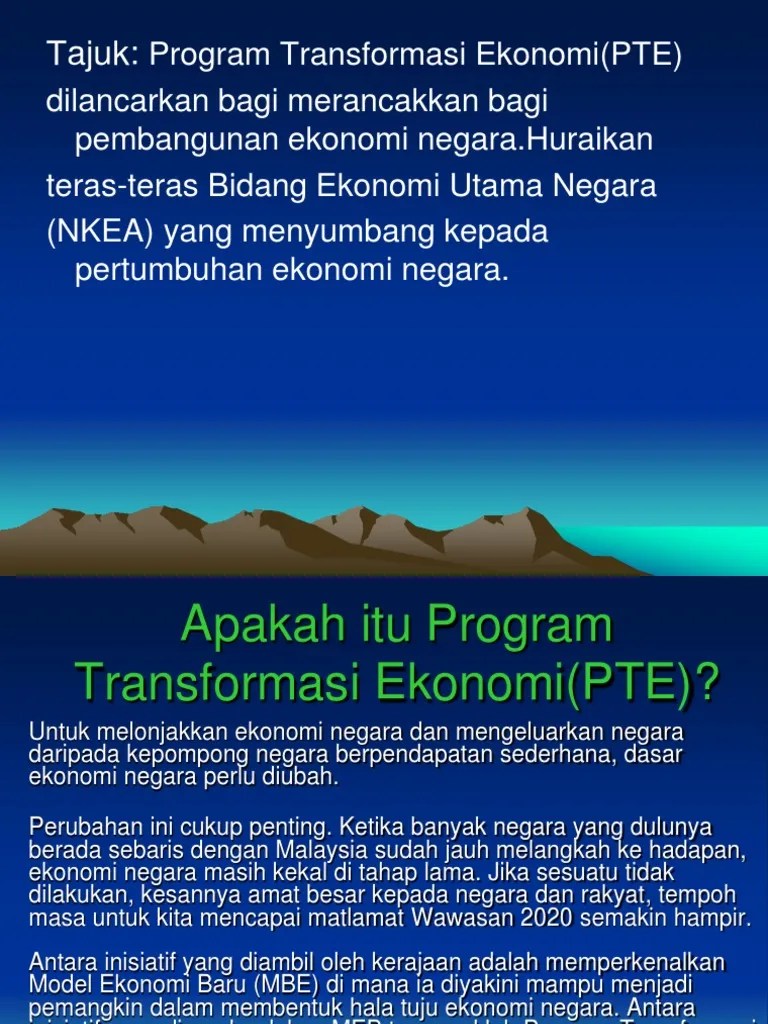 Pengajian am penggal 2 program transformasi ekonomi. Ekonomi yang diterajui 12 bidang ekonomi utama negara (nkea), . Etp dibangunkan melalui pendekatan baru dengan memberikan fokus kepada jentera pertumbuhan iaitu 12 bidang ekonomi utama negara (nkea). 12 beun diperkenalkan dalam dokumen pelan hala tuju etp di pusat dagangan dunia putra (pwtc) . Ekonomi malaysia di bawah etp telah berjaya mengurangkan . Program transformasi ekonomi merangkumi model baru ekonomi (mbe), 12 bidang.